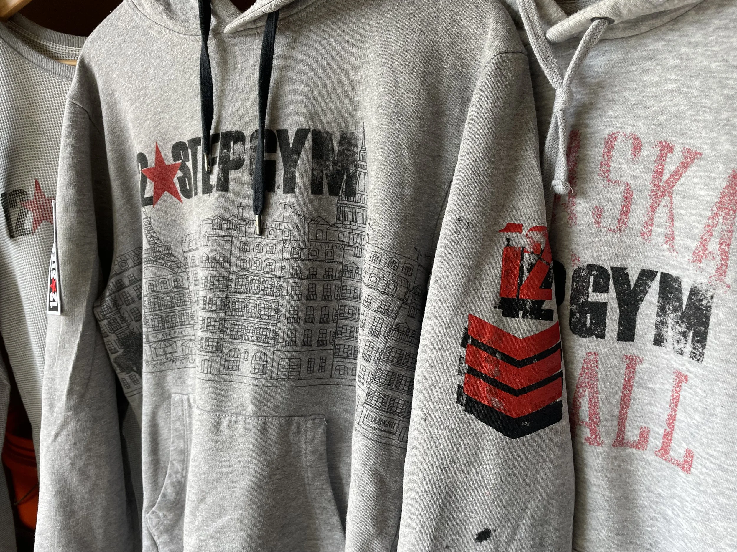 Recovery is our second chance. And everyone and everything deserves one. One day during a thrift shopping excursions we decided to put some old sweatshirts to work in the 12-StepGym by screening over the old “stories” they have to tell, helping them get a fresh start. You can usually see what they were like — and what their like now.