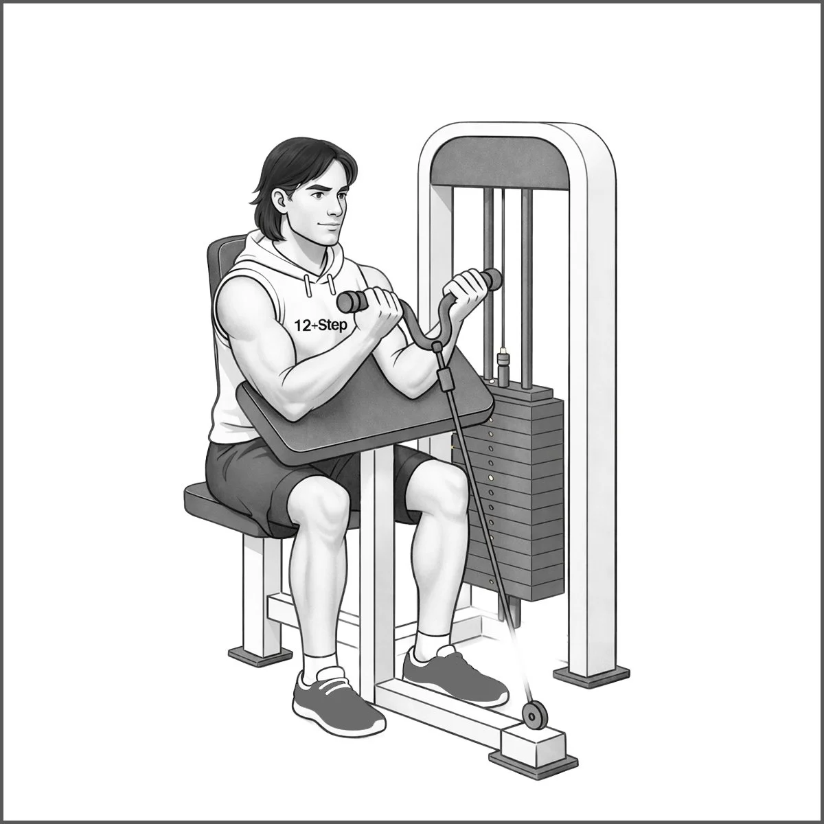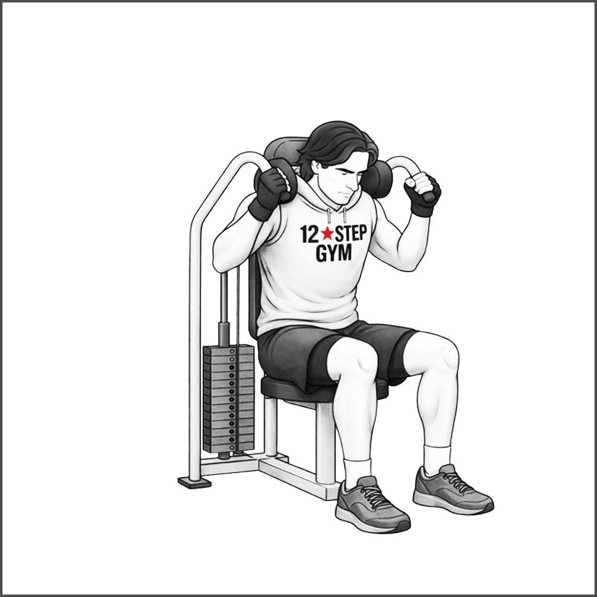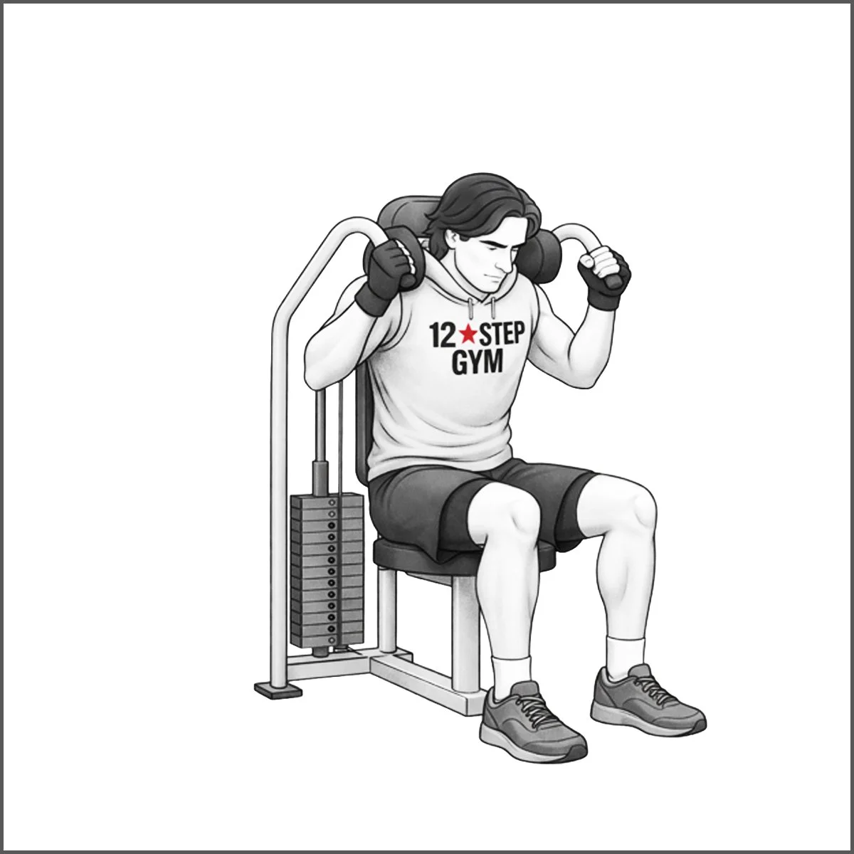 Sit upright on the seat, lean into the arms pad you’re your elbows slightly off the arm pad. Fully extend your arms, then draw up the weight slowly.