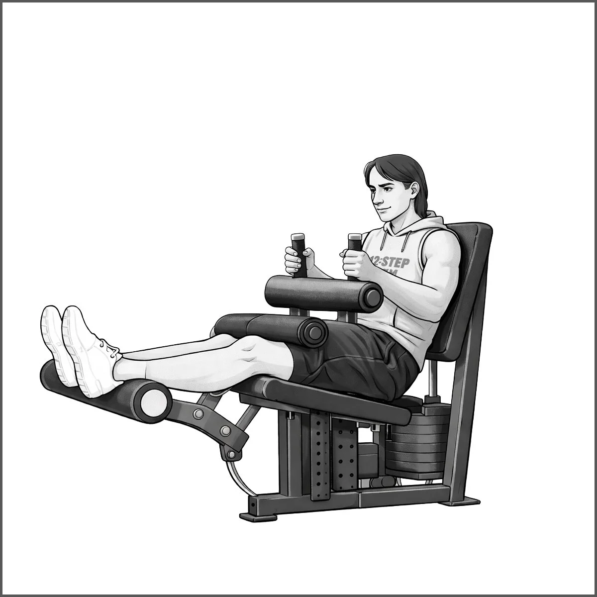 Sit back. Keep the upper stabilizer bar above your knees with your hands on the grips. Set the lower pad Just above the ankles. Go slow.