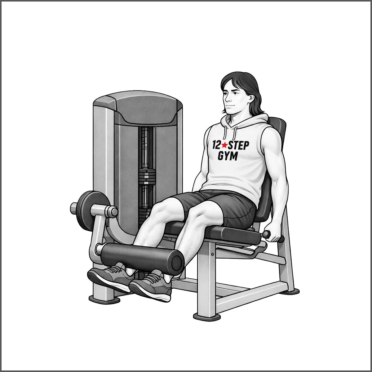 Keep your back straight against the seat. Alternate sets: point toes inward, then outward. Split-second stop at the bottom of each lift.