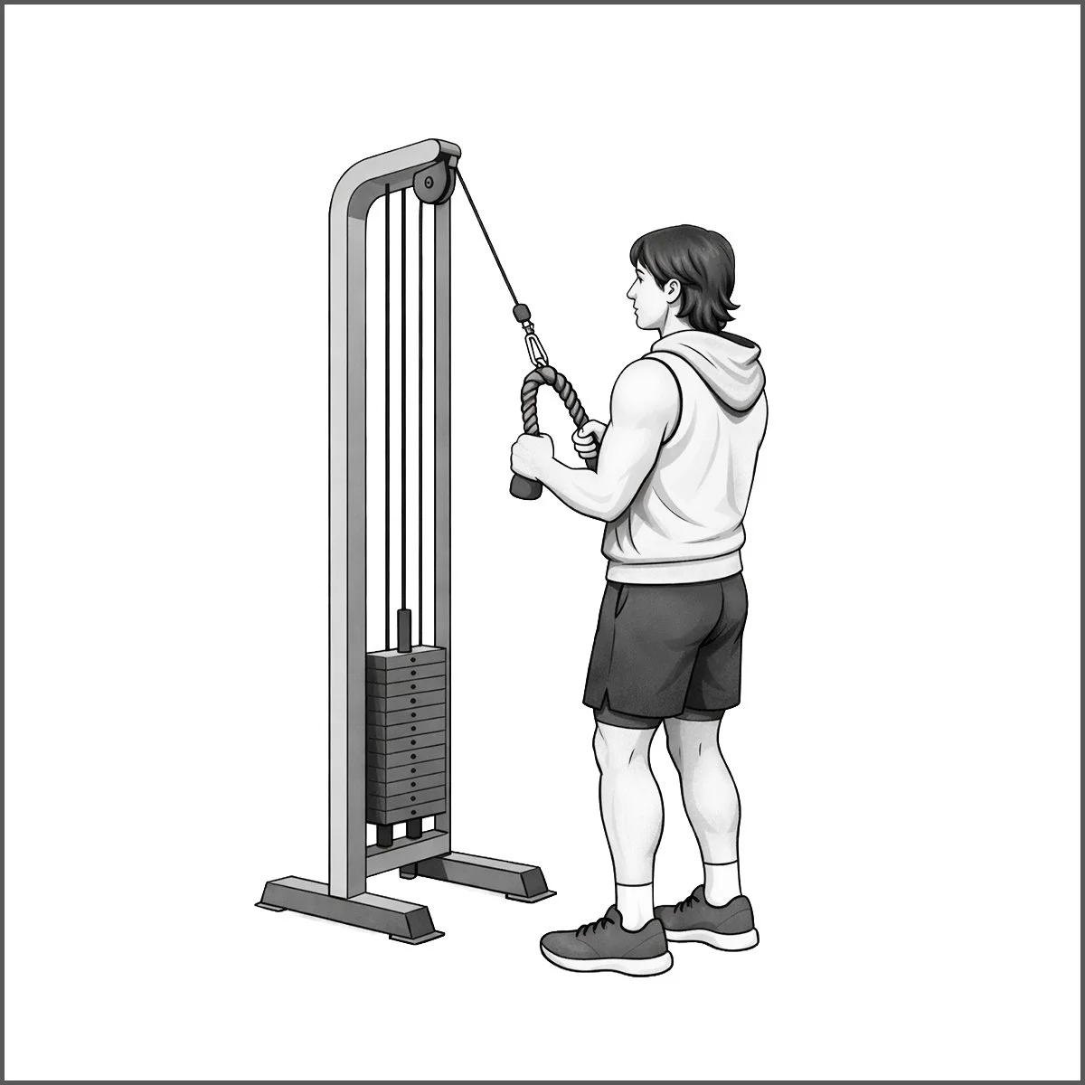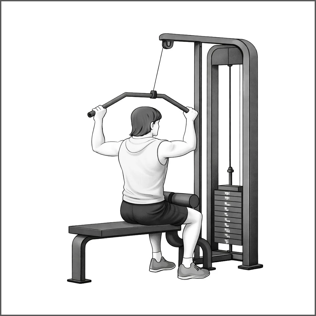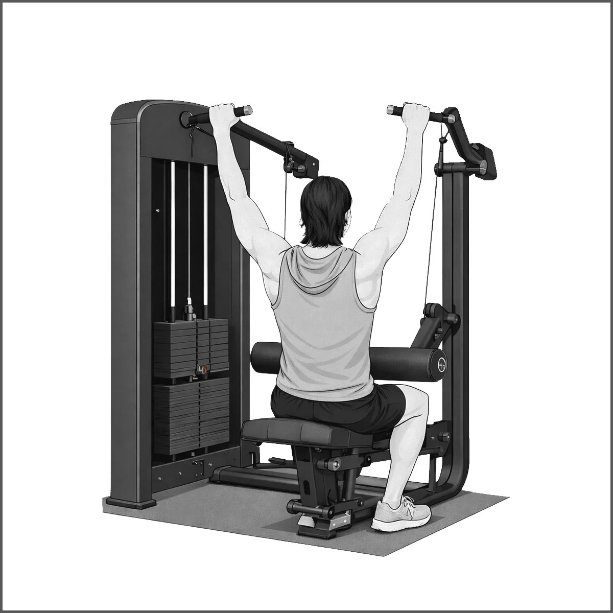 Set the seat low enough for full arm extension. Keep your back straight. Lean slightly forward, pronate your arms slightly before you pull slowly down.