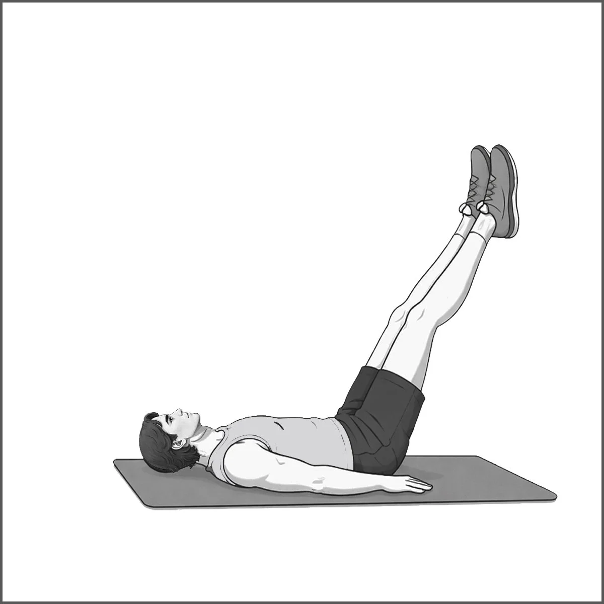 Lie on your back on a mat. Keep your hands behind your head. Lift your feet 6” off the ground. Start with 30-second lifts with five reps. Do three sets.