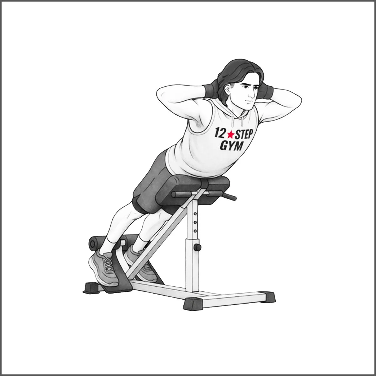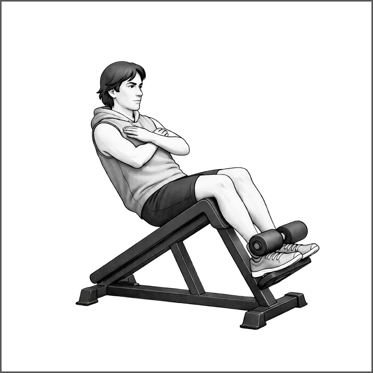 Stretch out with your feet on the foot pad. Place your hands behind your head. Bend at the waste and drop your head down toward the floor. Lift your upper body up slowly.