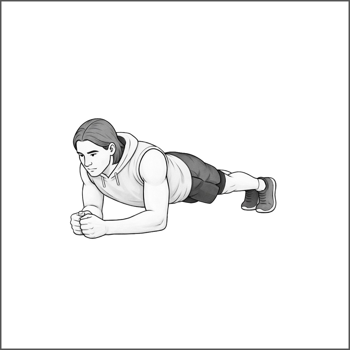 Lift your body off a mat with your elbows and toes. Keep your body and butt level. Breath in through your nose, push air out. Start with three one-minute planks